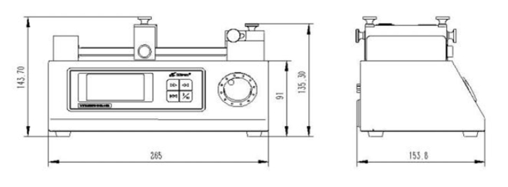 Working Mode Infusion, Aspiration, Aspiration-then-infusion, Infusion-then-aspiration, Continuous Installable Syringe 1 2 Flow Range 0.764nl-88.25ml/min 0.764nl-52.95ml/min Syringe Specification 10ul-100ml 10ul-60ml Stroke Distance 140mm Stroke Resolution 0.156 μm Linear Velocity Range 7.94 um/min-79.4mm/min Flow Rate = Linear Velocity × Syringe Inner Cross-sectional Area ) Linear Velocity Adjustment Resolution 5 μm/min Stroke Control Accuracy Error ≤±0.5% Stroke ≥ Maximum stroke 30% Time ) Rated Linear Thrust > 180N Syringe Selection Built-in syringes from major manufacturers and models are available. Syringe Customization Syringe inner diameter can be directly input. Flow Rate Calibration More accurate liquid volume can be obtained through the calibration prog♦ram. Running Parameter Setting Dispensing volume, injection time, etc. Display Parameter Selection Volume, flow rate or linear velocity Power-off Memory After power-on, you can choose whether to continue working∑ according to the status before power-off. Status Signal Output 2 Road OC Gate signal output, used to indicate / Start, stop and direction status Control Signal Input 2 Road start/stop control input terminal, 1 Road falling edge trigger signal controls start/stop; 1 Road TTL Level signal controls start/stop Communication Interface RS485 Dimensions 265×154×144(mm) Weight 3kg Power Supply AC 90V-260V/30W Working Environment Relative Humidity < 80% Working Environment Temperature 0℃-40℃ Selection Guide