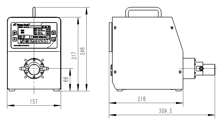 驅動器(qì)型号 CF4000W 泵頭型号 MP005 MP010 MP015 MP030 MP060 每轉排量 0.05mL 0.28mL 0.35mL 0.9mL 1.41mL 流量範圍mL/min 15-200 84-1120 105-1400 270-3600 423-5640 轉速範圍 300-4000rpm 電(diàn)機(jī) 直流無刷電(diàn)機(jī) 驅動形式 磁力驅動 流量範圍 15-5640mL/min(出口壓力為(wèi)0) 出口壓力範圍 0-15Bar,出口壓力越大(dà),流量越小(xiǎo) 輸送液體(tǐ) 液體(tǐ)內(nèi)顆粒≤10um 工(gōng)作(zuò)模式 流量模式、定時(shí)定速、定速定量、定時(shí)定量 液量累計(jì) 總液量累計(jì)與清零功能(néng) 時(shí)間(jiān)累計(jì) 運行(xíng)總時(shí)間(jiān)累計(jì)與清零功能(néng) 方案存儲 保存當前運行(xíng)方案,方便調用(yòng) 液量校(xiào)準 輸入實測灌裝液量,自(zì)動校(xiào)準,實現(xiàn)更高(gāo)精度液體(tǐ)傳輸與灌裝 鎖屏功能(néng) 鎖屏,防止誤碰或随意更改參數(shù) 全速功能(néng) 液體(tǐ)快(kuài)速填充與排空(kōng)軟管 方向控制(zhì) 液體(tǐ)傳輸方向控制(zhì) 預約啓動 設定日(rì)期時(shí)間(jiān),預約啓動 定時(shí)啓動 按設定時(shí)間(jiān),定時(shí)啓動 語言設置 中英文(wén)界面切換 恢複出廠(chǎng)設置 恢複出廠(chǎng)設置功能(néng) 轉速控制(zhì)精度誤差 ≤0.2% 外(wài)部信号輸入 0-5V、0-10V、4-20mA、0-10KHz外(wài)部信号調速功能(néng)(僅用(yòng)于流量模式)÷ 啓停控制(zhì) 外(wài)部信号啓停控制(zhì),開(kāi)關量及電(diàn)壓方式可(kě)選 腳踏開(kāi)關 選配腳踏開(kāi)關控制(zhì)啓停 通(tōng)信功能(néng) 采用(yòng)Modbus RTU通(tōng)信規約 灌裝時(shí)間(jiān) 0.1s-9999.9Hr 間(jiān)隔時(shí)間(jiān) 0.1s-9999.9Hr 操作(zuò)方式 4.3吋工(gōng)業(yè)觸摸屏結合薄膜按鍵 分(fēn)配次數(shù) 0-99999次(0為(wèi)無限循環) 工(gōng)作(zuò)環境 溫度0-40℃,相(xiàng)對(duì)濕度<80% 适用(yòng)電(diàn)源 AC90-260V,50/60Hz 功率消耗 <150W 尺寸 310x157x246mm 重量 5kg 防護等級 IP31 外(wài)部信号控制(zhì)